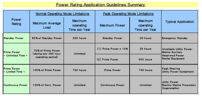 Standby Rating은 일 년에 200시간 동안 사용할 수 있고 최대용량으로는 일 년에 25시간만 돌릴 수 있습니다. 평균 용량은 최대용량의 80%로 운전해야 합니다.