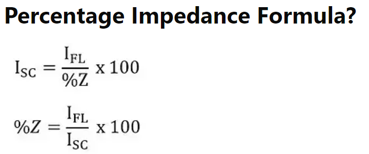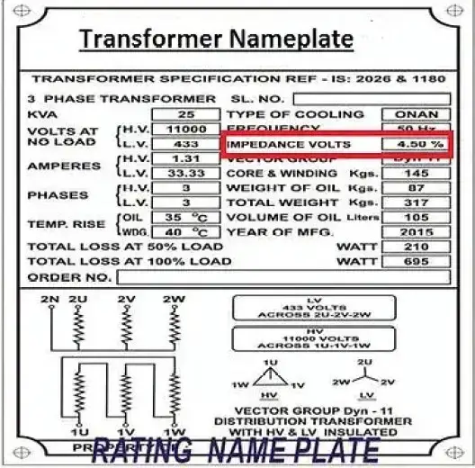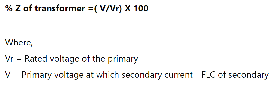 HV측 전압은 0V부터 점진적으로 증가시켜야 합니다. 2차측 전류가 2차 전부하 정격 전류까지 될 때까지 점진적으로 전압을 증가시킵니다. 2차측 전류에서의 1차 전압(V)은 변압기의 전부하 전류와 동일합니다. 변압기의 임피던스 백분율 공식은 다음과 같습니다;