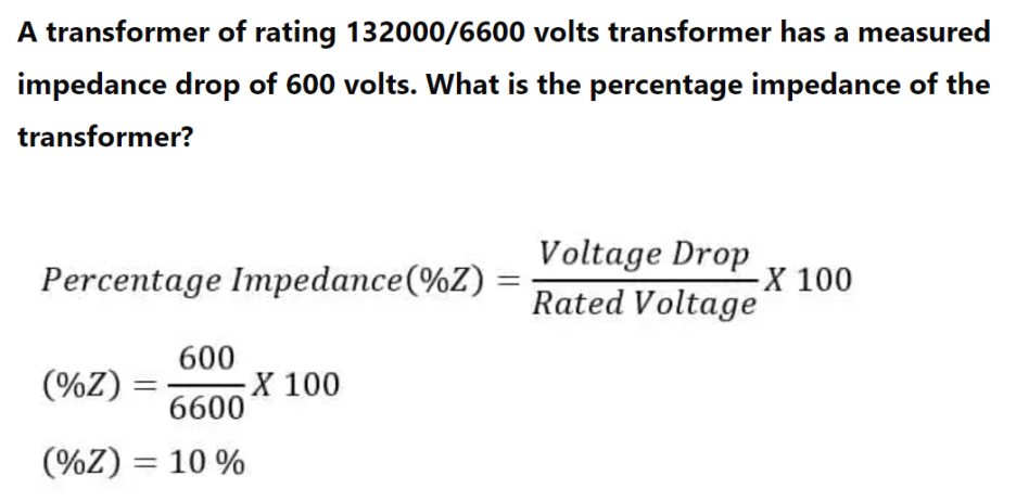 변압기가 정격 2차 전류까지 전부하가 걸리면 변압기 권선 저항과 리액턴스에 의해 전압 강하가 일어납니다. 전압 강하는 정격 전압으로 표현됩니다. 6600V의 정격 1차 권선이 전부하가 되고 측정된 전압 강하가 600V이면 전압 강하 백분율은 10%이므로 변압기 %임피던스는 10%입니다.