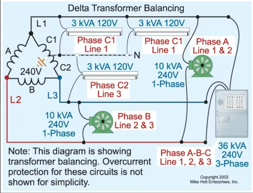 델타/델타 변압기의 크기를 계산하려면 변압기 각 상의 부하가 균형을 이루어야 합니다. 두 단계의 과정을 통해 변압기의 용량을 산출할 수 있습니다: