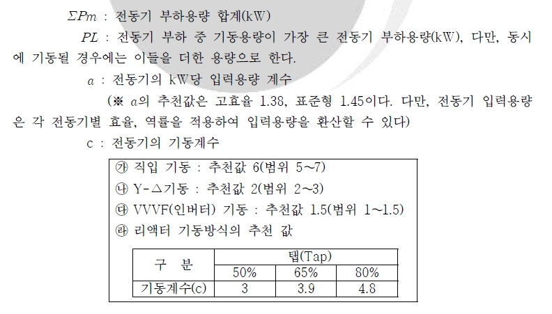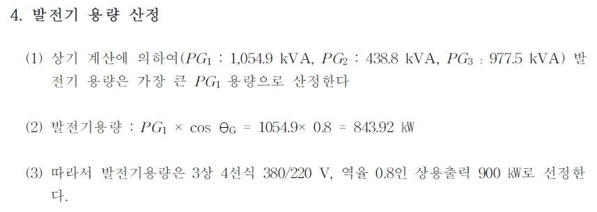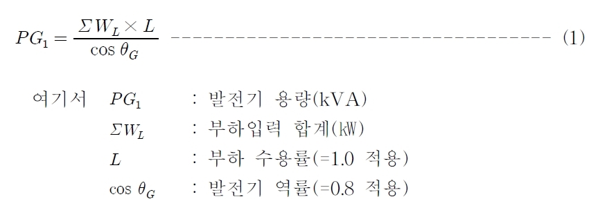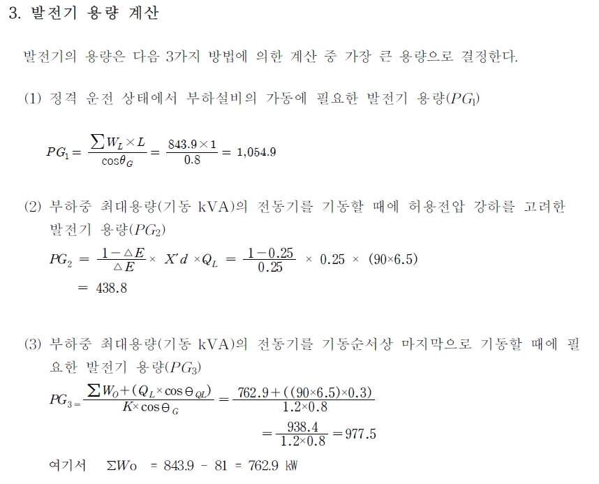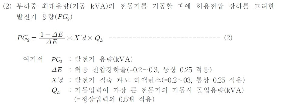따라서 이 수식으로 계산하면 대용량 전동기의 크기에 따라서 발전기 용량이 다소 크게 나올 가능성이 높다고 볼 수 있습니다.