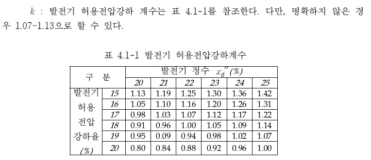 k는 발전기 허용 전압 강하 계수인데 KOSHA GUIDE에는 정확한 대응 값이 없습니다. 그런데 X"d 값과 전압강하율을 확인해서 k값 테이블에서 찾아보면 X"d = 25, 전압강하율 = 25%에 대응하는 값이 없어서 근접한 값인 "1"을 적용