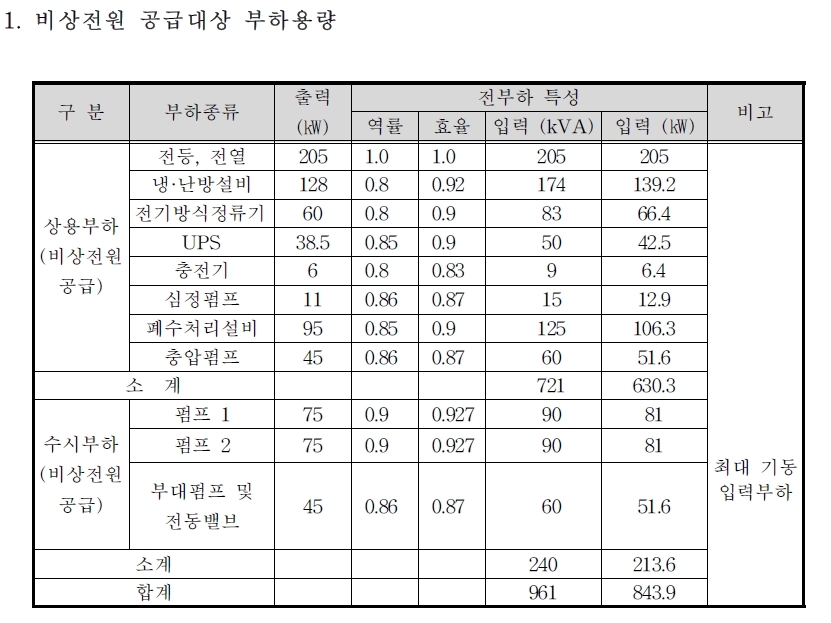 이상에서 검토한 결과 KOSHA GUIDE의 계산식을 적용하는 것이 전동기 부하가 큰 공장에서는 더 경제적인 계산을 할 수 있다는 것을 확인했습니다. 국토교통부의 설계기준은 건축물에 적용할 경우 건축물에는 큰 용량의 전동기가 없으므로 적정한 값을 산출 할 수 있을 것으로 보이지만 용량이 큰 전동기가 있는 경우는 불필요하게 발전기 용량이 더 커지는 문제가 있다는 것을 이해하시면 되겠습니다.