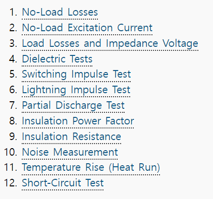 여기서는 주요 12개의 시험에 대하여 간략하게 설명하도록 하겠습니다. 이 12개의 시험 목록은 완전하지 않으며 Turn ratio test 또는 Measurement of voltage ratio 및 check of phase displacement와 같이 누락된 테스트가 일부 있습니다.