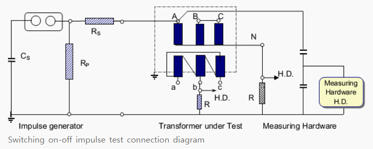 스위칭 임펄스 시험은 고전압측 단자와 접지 사이에 스위칭 임펄스 파형을 인가합니다.