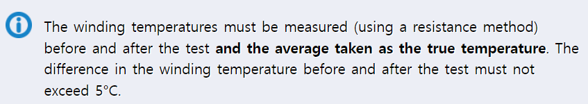 권선 온도가 시험 전과 후에 저항법을 사용하여 측정되어야 합니다. 그리고 두 측정값의 평균을 실제 온도로 정하게 됩니다. 시험 전과 후의 권선의 온도 차는 5도를 초과하면 안 됩니다.