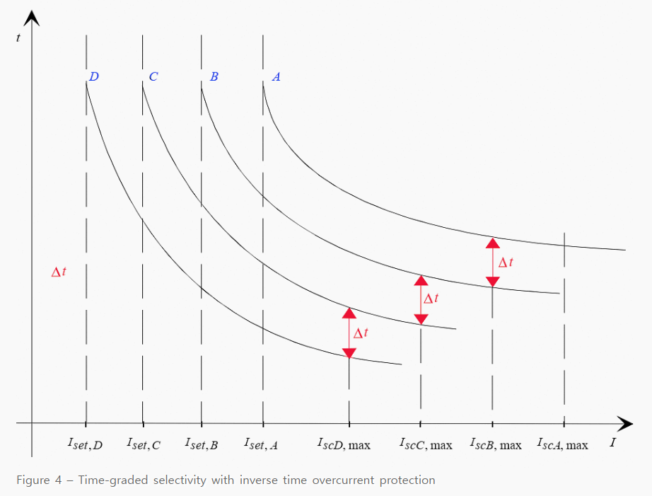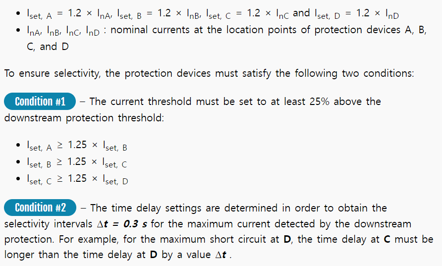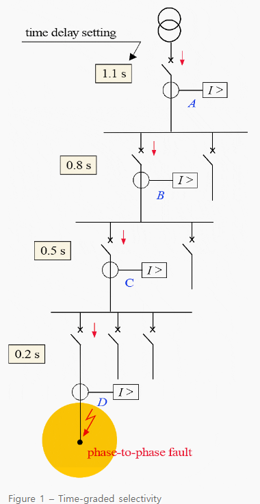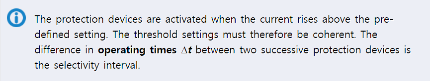 보호장치는 전류가 미리 정의된 정정값 이상으로 상승하면 동작됩니다. 그러므로 임계 정정치는 일관성이 있어야 합니다. 두개의 연속되는 보호장치들 간의 동작 시간에서의 차이는 선택성을 위한 간격입니다.