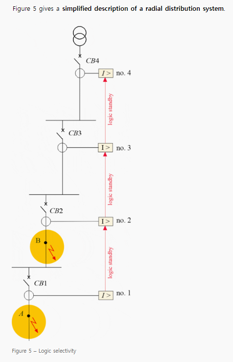 우리가 방금 본 것처럼, 시간 등급 선택성에는 몇 가지 약점이 있습니다. 이런 결점 때문에 논리 선택성 시스템이 설계되었습니다. 이 시스템을 사용하면 트립이 발생할 때 완벽한 선택성을 얻을 수 있고, 더욱이 소스에 가장 가까운 곳에 위치한 회로 차단기의 트립 시간 지연이 상당히 줄어듭니다.