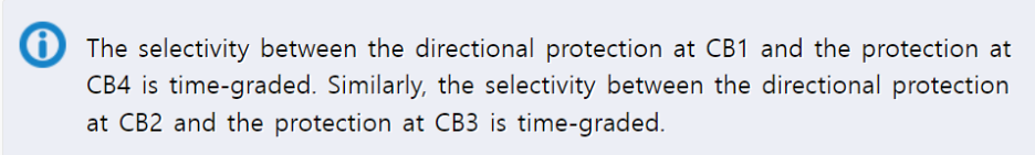 CB1에서의 방향성 보호와 CB4에서의 보호 사이에는 시간 등급이 있습니다. 비슷하게 CB2에서의 방향성 보호와 CB3에서의 보호 사이에도 시간 등급이 있습니다.
