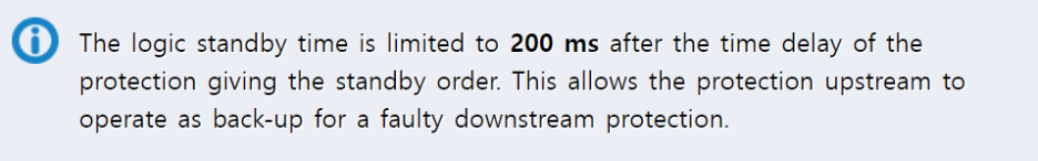 로직 대기 시간은 대기 명령을 주는 보호 장치의 시간 지연 이후로 200ms 까지로 제한됩니다. 이것은 상단 보호 장치가 고장 난 하단 보호 장치의 백업으로 동작하는 것을 허용해야 하기 때문입니다.
