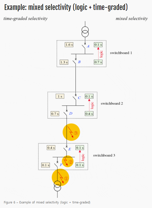 로직 선택성은 각 스위치보드의 들어오는 피더와 나가는 피더 사이에 설정됩니다. 로직 링크 와이어는 차단기 또는 릴레이를 동일한 스위치보드 내에 연결하기 때문에 비용이 적게 듭니다. 따라서 서로 다른 스위치보드 사이에는 시간 등급 선택성이 설정해서 스위치보드 간의 긴 로직 링크는 고려하지 않습니다.