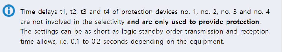 보호 장치의 시간 지연 t1, t2, t3, t4는 선택성에 포함되지 않으며 단지 보호를 제공하기 위해 사용된 시간입니다. 이 세팅은 로직 대기 명령을 주고받는 시간이 허용하는 한 짧게 할 수 있습니다. 즉 장치에 따라 01에서 0.2초 가 소요됩니다.