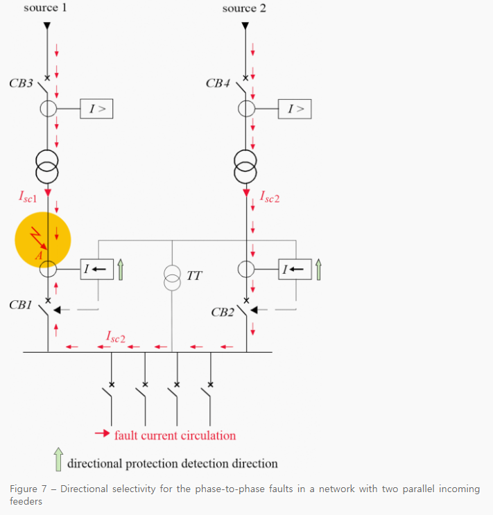 - CB2에서 방향성 보호는 동작하지 않는데 이는 그것의 보호 감지에 반대되는 방향으로 순환 전류가 흐르기 때문입니다.