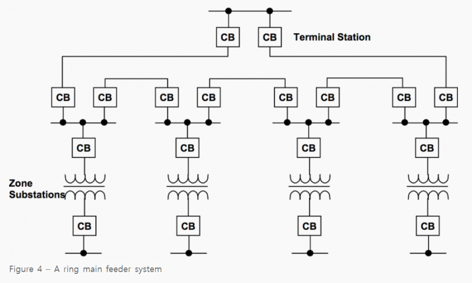 링의 첫 지점과 끝 지점은 같은 위치에 있지만 전력은 링 주변에 설치된 변전소로 링의 양쪽 경로로 공급됩니다.