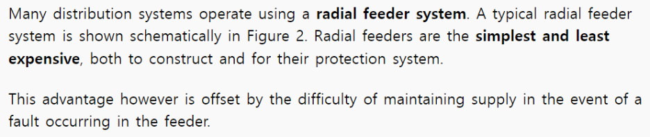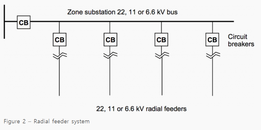 많은 배전 시스템은 방사형 피더 시스템을 사용하고 있습니다. 전형적인 방사형 피더 시스템은 그림2에서 개략적으로 보여집니다. 방사형 피더는 건설과 보호 시스템에 있어서 가장 단순하고 최소의 비용이 소요됩니다.