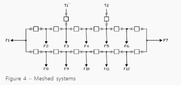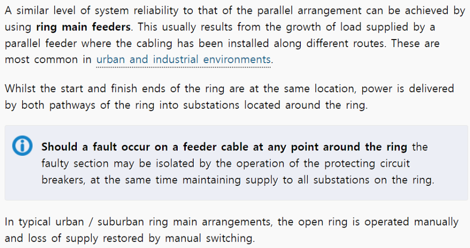 송전 및 하부 송전 시스템에서는 병렬, 링 혹은 상호 연결된 (Meshed) 시스템들이 사용됩니다. 이것은 송전 라인이나 기기에 고장이 발생할 경우 수용가에 대안 공급 방안을 제공할 수 있도록 하기 위한 것입니다.