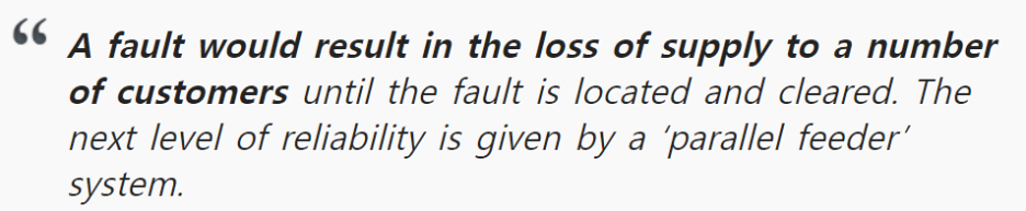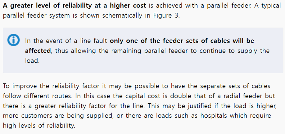 고장이 발생하면 고장의 위치가 확인되고 해소되기까지 다수의 수용가에 대한 전력 공급의 상실을 초래합니다. 다음 단계의 신뢰도는 병렬 피더 시스템에 의해 제공됩니다.