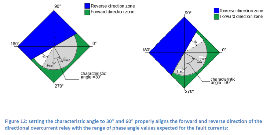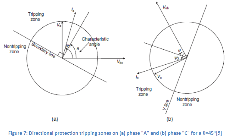 고장의 방향을 결정하기 위해 보호 장비는 전류와 분극 변수(polarisation variable) 사이의 위상 변위를 측정합니다. 분극 변수가 원하는 계전기 동작의 대칭축에 있지 않은 경우 특성 각도를 조정하여 위상을 재설정해야 합니다. 이 각도는 보호 협조 (protection coordination) 설계 과정에서 결정되어야 합니다. 선택한 방향의 고장은 트리핑 존에 떨어지는 전류를 유발하고 반대 방향의 전류는 이 존 밖으로 떨어지는 전류를 유발합니다. 분석은 특성 각도 θ = 30°, θ = 45° 및 θ = 60°의 일반적인 값과 세가지 고장 즉 A와 B 사이의 상간 고장, A와 C 사이의 상간 고장 그리고 대지간 고장에 대해 수행됩니다. 이 세 가지 고장은 개별적으로 분석됩니다. 또한 임피던스의 저항-유도 특성도 가정합니다 (이 가정은 거의 항상 사실입니다).