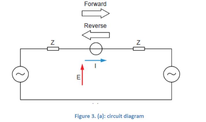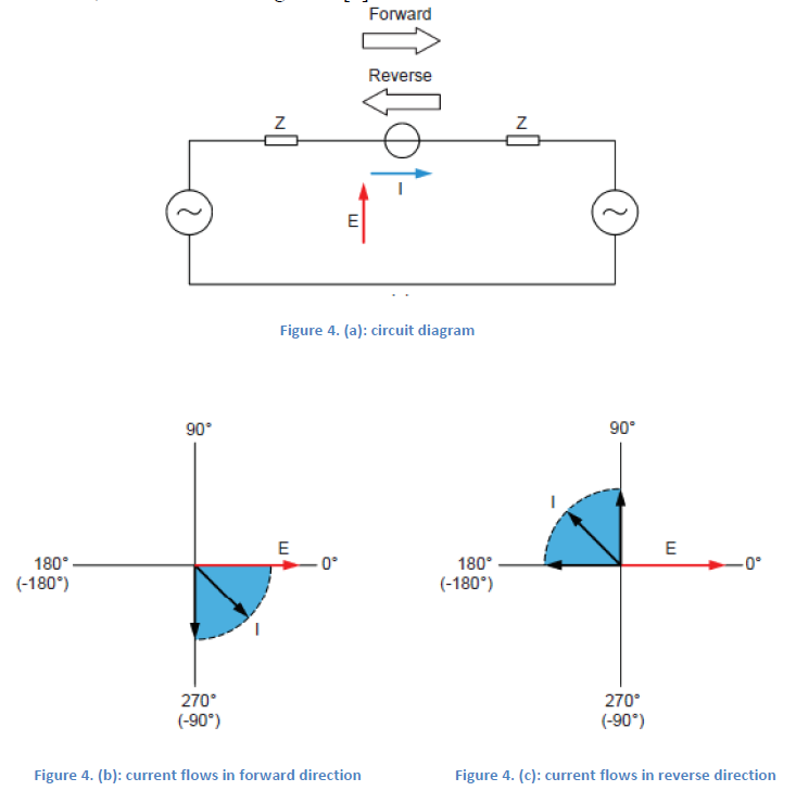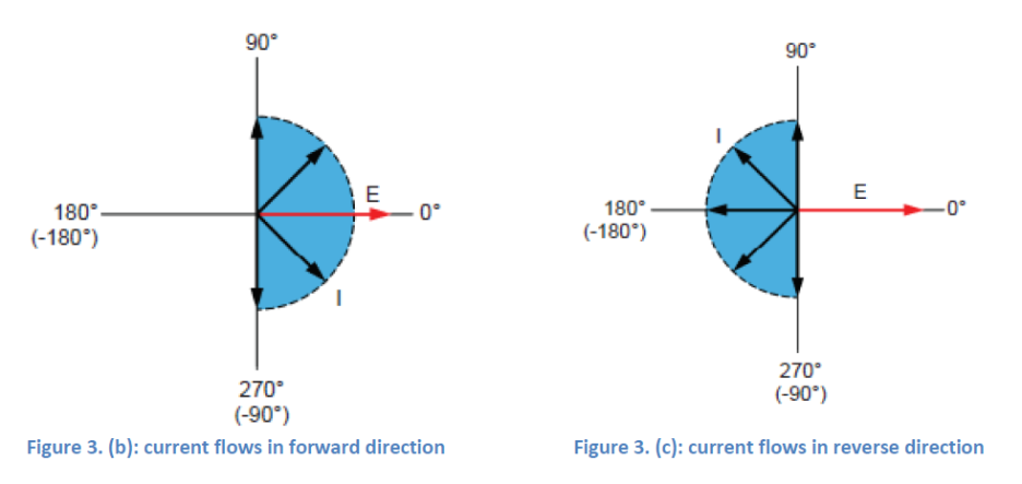 회로에서 전류가 왼쪽에서 오른쪽으로 흐를 때 전압과 전류 간 위상 변이의 절대값이 90° 이하(그림 3b)로, 정확한 위상 변이의 값은 회로 임피던스 Z의 값에 의존합니다. 이 방향은 일반적으로 정방향으로 간주됩니다. 한편, 회로에서 전류가 오른쪽에서 왼쪽으로 흐를 때 전압과 전류 간 위상 변이의 절대값이 90° 이상(그림 3c)으로 정확한 값은 회로 임피던스 Z의 값에 의존합니다. 이 방향은 일반적으로 역방향으로 간주됩니다.