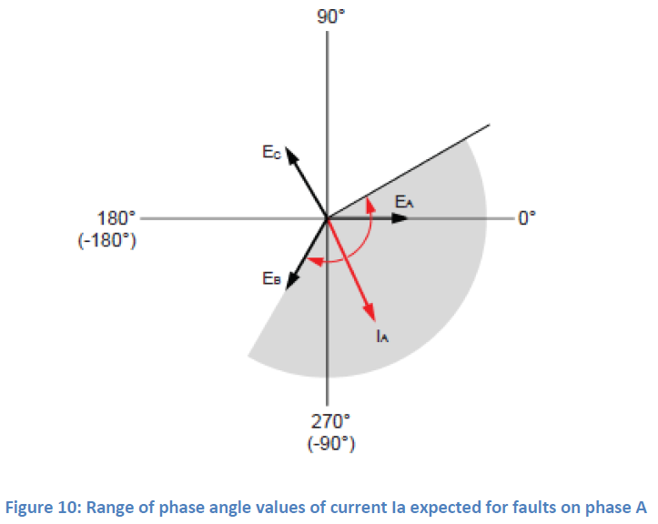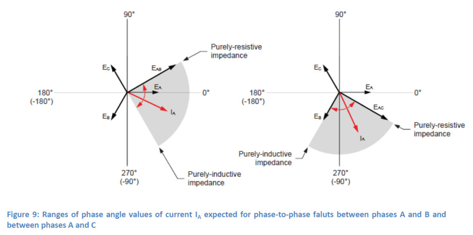 상 A와 B 사이 및 상 A와 C 사이의 상간 고장에 대해 예상되는 전류 IA의 위상 각도 값 범위는 그림 9에 나와 있습니다: