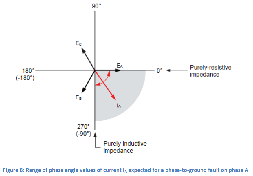 대부분의 전력망에서 임피던스는 저항-유도 특성을 갖습니다. 이 경우 전류의 위상각 값의 예상 범위는 그림 4와 같이 전류 흐름의 각 방향에 대해 90°로 줄어듭니다. [4]