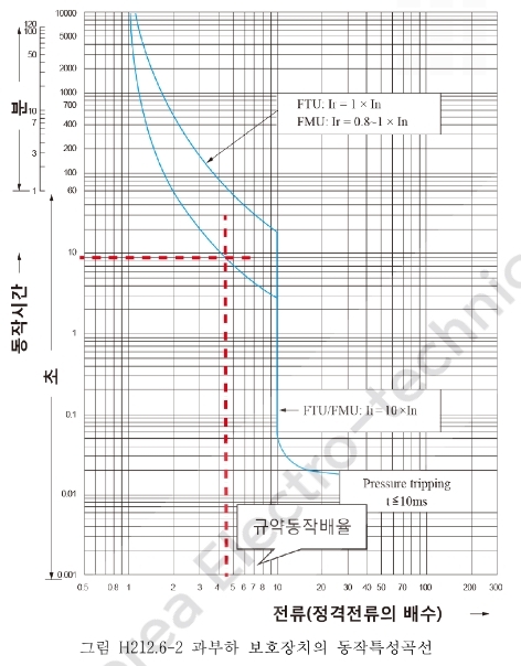 보호장치의 규약 동작 배율을 계산하는 그래프가 KEC에서 다음과 같이 보여줍니다.