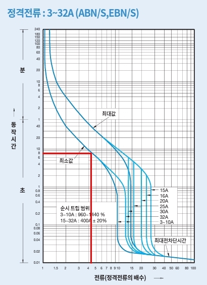 차단기가 ABS53C 30AT을 사용한다면 이때 규약동작배율을 찾아보면 아래 그래프에서 약 4.3을 확인할 수 있습니다.