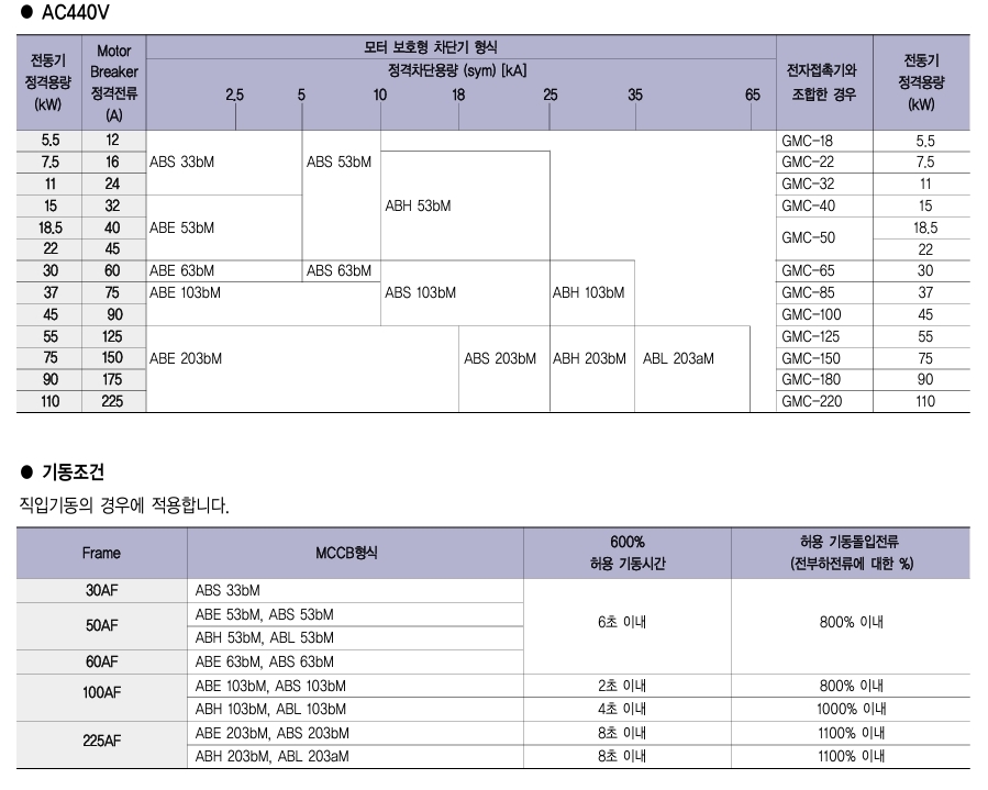 아래의 표에서 11kW 전동기에 대한 차단기의 형식은 ABS 33bM으로 확인됩니다. 그런데 정격차단용량이 5kA 이상이 되면 ABS 53bM으로 변경됩니다. 위의 계산 값과 일치하는 결과를 얻을 수 있습니다. (현재는 b 가 아닌 c Type으로 변경됨)