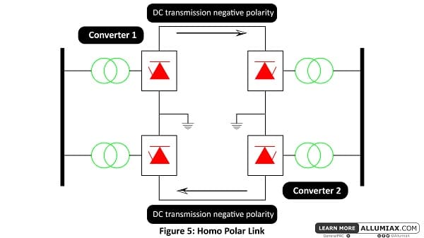 호모폴라 링크는 보통 음극인 같은 극성의 도체 두 개로 구성되며, 항상 대지를 복귀 전도체로 사용합니다. 이 링크의 극들이 병렬로 작동하므로 설치 비용이 절감됩니다. 이 유형의 링크는 적용이 제한적이고 매우 복잡합니다. 따라서 현재 사용되지 않습니다.