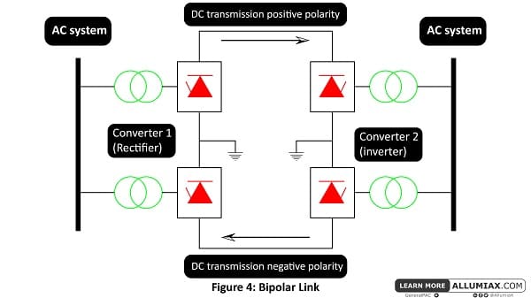 Bi는 '2'를 의미하므로 바이폴라 링크는 두 개의 도체가 하나는 양극이고 하나는 접지에 음극입니다. 또한 각 끝에 있는 변환기 스테이션과 접지를 위해 변환기 스테이션의 중간 지점에 연결된 전극으로 구성되어 있어 각 극이 독립적으로 작동할 수 있습니다. 또한 바이폴라 링크 중 하나라도 작동을 멈추면 대지 복귀 시스템 때문에 링크가 자동으로 모노폴라 모드로 변환되어 시스템의 절반이 계속 전원을 공급합니다. 바이폴라 링크는 장거리 HVDC 전송에 널리 사용됩니다.