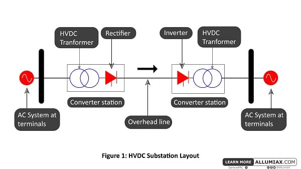 변전소를 생성하는 과정에서 교류 전원이 발생되고, 이를 정류기를 이용하여 직류로 변환됩니다. 직류는 오버헤드 라인을 통해 흐르게 되고, 다시 사용자단에서 인버터를 이용하여 교류로 변환된 후 부하에 교류가 공급됩니다. 정류기와 인버터는 송수신단의 컨버터 스테이션 내부에 배치됩니다.