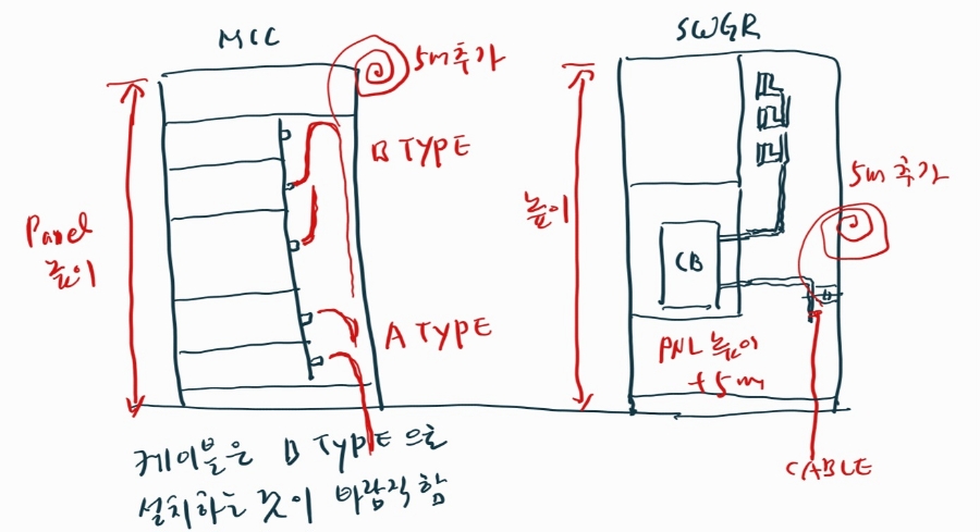 SWGR나 MCC에서 수직으로 어느 높이에 케이블이 연결될지 모르는 경우에는 기본적으로 SWGR나 MCC의 높이를 더해주고 거기에 +5m를 추가합니다. 이 길이는 케이블 터미네이션이 실패했을 경우에도 한 번 더 할 수 있는 여유를 주려는 목적이고 또 케이블 말단은 수분이 침투했을 가능성 때문에 보통 잘라냅니다. 그런 여유가 필요합니다.