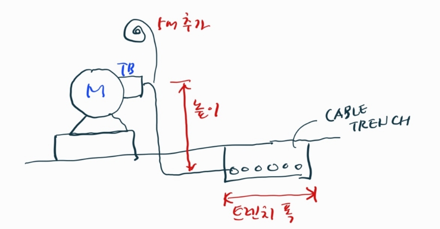 Motor 쪽도 마찬가지입니다. Motor의 Terminal box 높이를 더하고 추가로 +5m를 더합니다. 이런 수직 마진은 유사시에 요긴하게 사용됩니다. 케이블이 실제로 남으면 아래쪽 Tray 내부에 남는 길이가 깔아 둡니다.