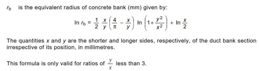 IEC60287-2-1 2.2.7.3의 수식을 적용하는 데는 위의 설명과 같은 제한이 있습니다. 이 수식은 사각형의 트렌치를 등가 원형으로 변환해서 계산하는 방식인데 사각형을 원형으로 전환하는 데는 가로 세로의 비율의 제한이 있습니다. y/x < 3이라는 제한을 고려해야 합니다. 그래서 아주 폭이 길면 적용하기 어렵습니다.