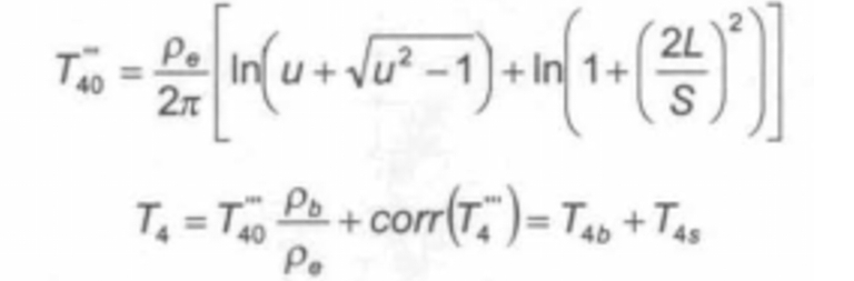 아래의 수식은 참고자료 5에서 가져온 수식입니다. T40'''은 IEC60287-2-1에서의 원 수식과 같습니다. 그리고 여기에다 2.2.7.3의 보정값을 더하면 되는데 이때 적용하는 방식이 이 자료에 나와 있습니다. 그래서 나온 수식이 두번째 T4로 나타납니다.