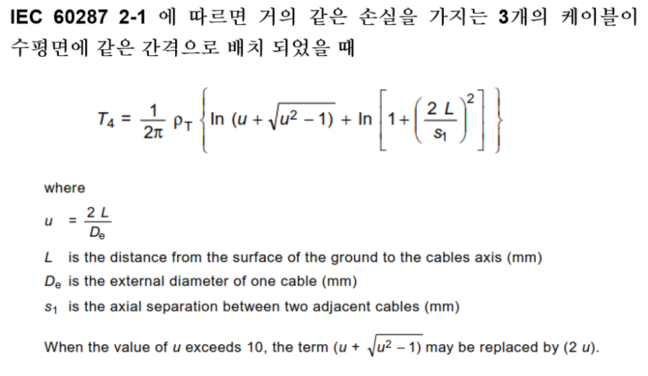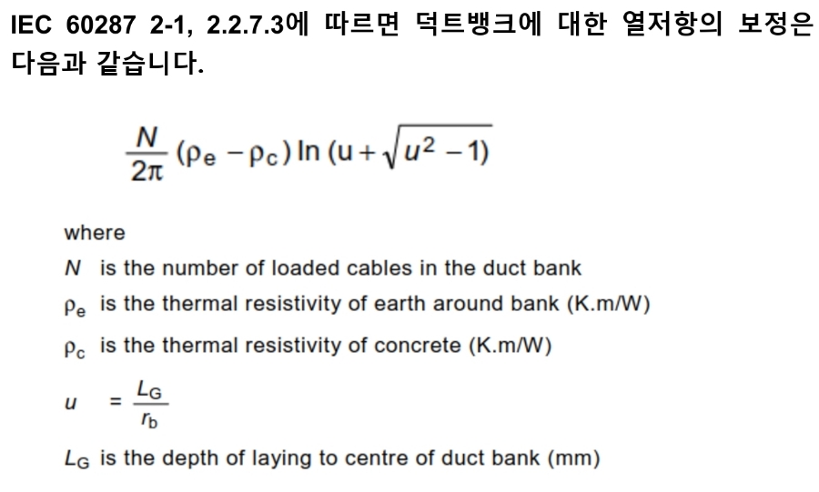 그런데 덕트뱅크에 포설된 케이블의 토지 열저항 영향을 고려하기 위해서는 다음의 수식이 추가됩니다.