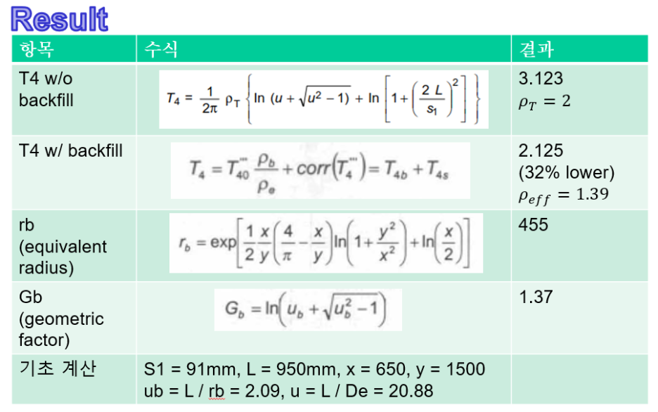 이 수식을 적용하면 우리는 주변 토양의 열저항 계수가 높아도 그것을 낮추는 대응 방안을 가지게 되는 것입니다. 예전에는 실무에서 내부의 Backfill material의 열저항 값을 그대로 전체 열저항 계수라고 생각하고 계산해서 계산서를 제출했었습니다. 그런데 사실 그 방법은 틀린 것입니다. 내부 일정 공간에만 Backfill material을 다른 것으로 채웠다고 해서 주변 전체 토양의 열저항을 무시할 수가 없는 것이죠. 케이블 -> 내부 백필 모래 -> 외부 토양으로 이어지는 열전달 경로를 생각해서 그 영향을 고려하여 계산했어야 하는데 다 잘 몰랐고 발주처도 몰라서 그냥 넘어갔었죠.