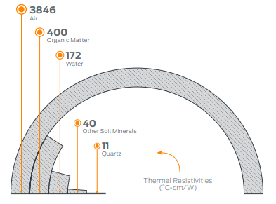 첫째는 물입니다. 흙은 입자의 크기가 다 달라서 입자들 사이에 공간이 있습니다. 이 공간이 물로 채워지면 열저항이 떨어집니다. 왜 그럴까요? 물이 없으면 공기가 그 공간을 채웁니다. 위의 자료를 보시면 공기의 열저항은 3846℃-cm/W이고 물은 172℃-cm/W입니다. 물도 흙보다 높지만 그래도 공기에 비할 바는 아닙니다. 그래서 물이 많으면 토지 열저항이 낮아지는 것입니다.