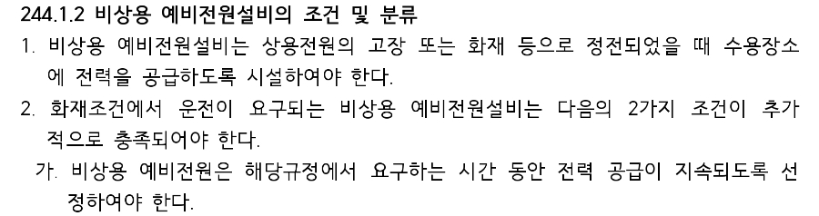KEC는 244 비상용 예비전원설비에서만 비상용 전원에 대해서 다룹니다. 그런데 여기에서는 비상용 전원 전체에 대한 것을 말하는 것이기 때문에 비상용 발전기에 대하여 특별한 내용이 없습니다.