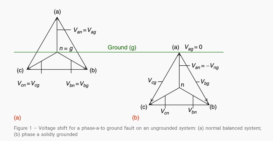 한상의 지락 고장이 발생하면 비접지 계통에서는 일반 평형 전압 삼각형이 그림 1에 보이는 것 같이 이동하게 됩니다. 직렬 상 임피던스를 통해서 흐르는 작은 전류가 전압 삼각형을 매우 조금 변형시킵니다 그러나 실제적으로는 그림 1b와 같이 보여집니다.