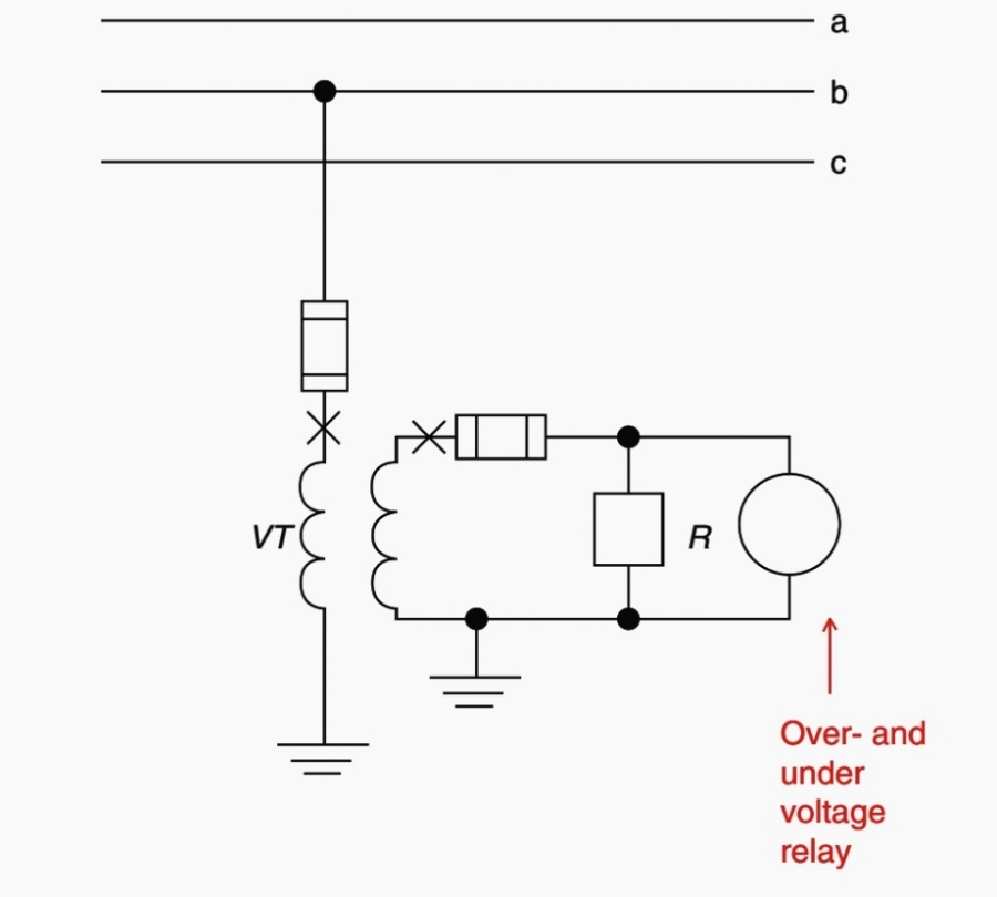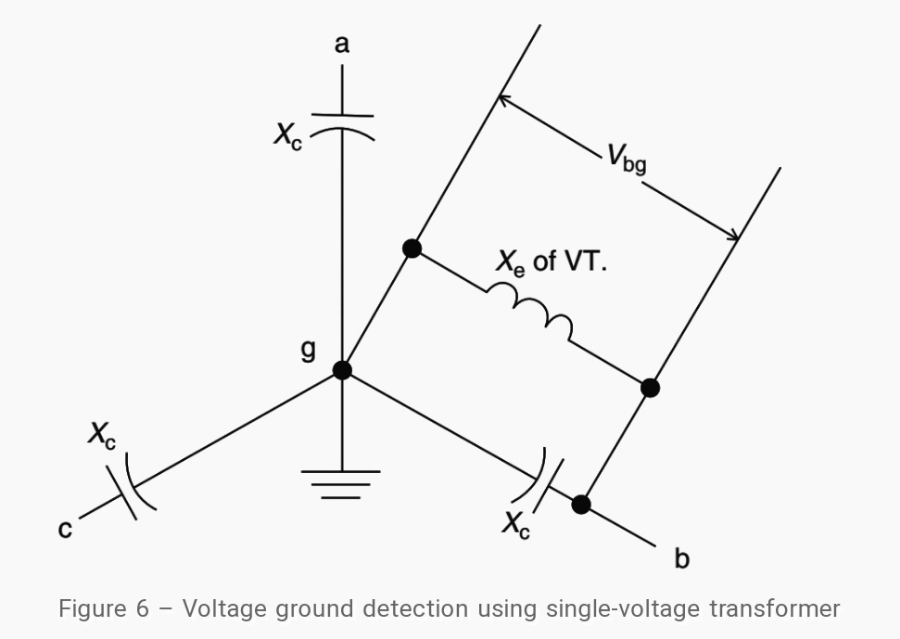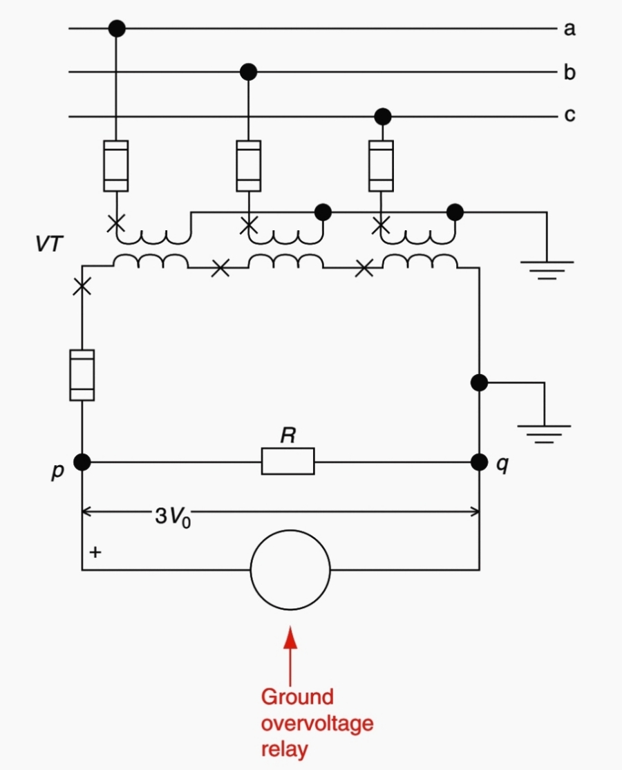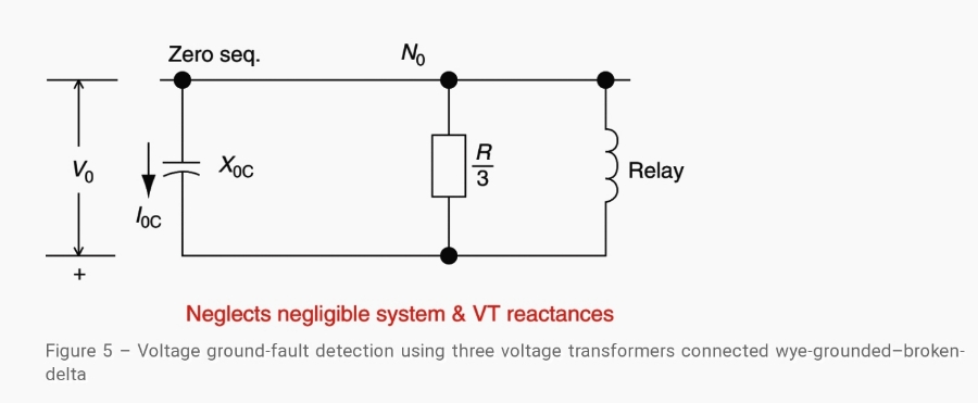 이런 지락 검출 방식은 위에서 보여진 중성점 전도(neutral inversion)와 철공진을 피하기 위해서 매우 주의깊게 사용되어야 합니다. 전압 계전기는 정상 상전압의 2차 전압에 대해서 그 접점이 개방되어 있도록 세팅됩니다.