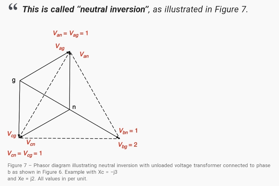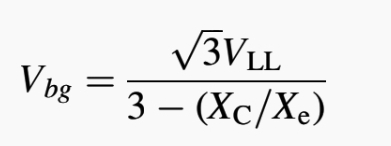 만약 배전 시스템 커패시턴스 Xc가 변압기의 여자 리액턴스 Xe에 의해서 나눠진 값이 3과 같으면 이론적으로 Vbg는 무한대가 됩니다. 전압 변압기의 포화가 이것을 방지하지만 전압 삼각형 abc에 대해서 그것의 접지 포인트가 이 삼각형의 아주 바깥쪽에 위치할 가능성이 높습니다.