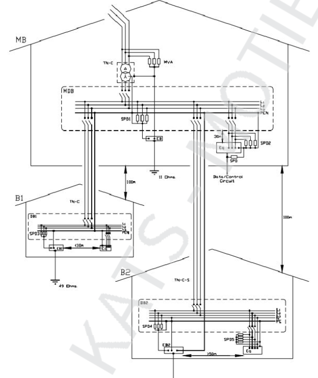 플랜트의 경우 대부분이 인입 지역에만 SPD를 설치하면 됩니다. 다만 SPD와 보호 기기의 거리가 50m 보다 크면 별도의 보호기기를 설치할 필요가 있습니다.