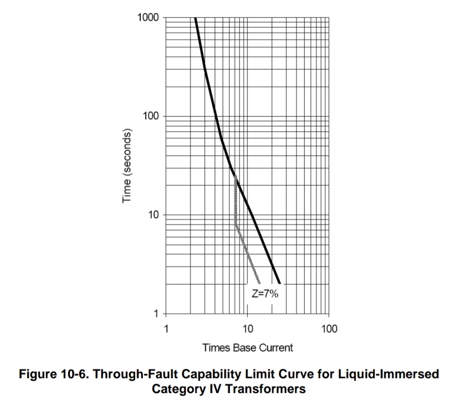 전력 변압기에 대한 시스템 조건들의 장기간에 걸친 영향을 좀 더 포괄적으로 나타내기 위해서는 각 카테고리가 변압기를 통과하는 최대 전류의 함수인 통과 고장 능력 한계를 포함해야 합니다. 최대 전류 (변압기 정격의 pu로 표시)는 카테고리 I 과 II의 변압기에 대해서는 변압기 단락 임피던스에 기초하여 계산됩니다. 카테고리 III과 IV의 변압기에 대한 최대 전류 계산은 변압기 단락 임피던스와 시스템 임피던스를 합친 전체 임피던스로 계산됩니다.