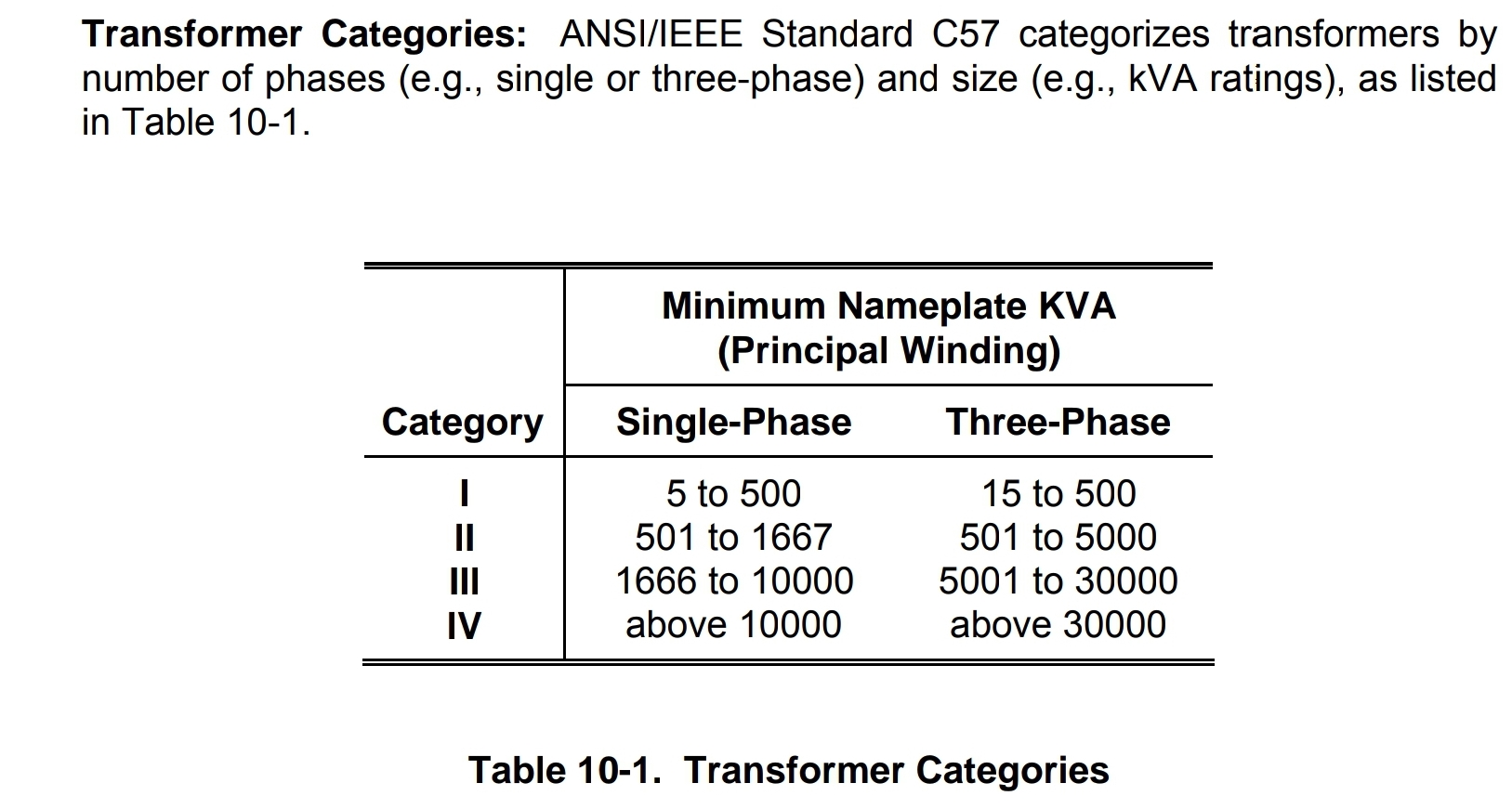 ANSI/IEEE C57은 변압기를 상과 용량에 따라서 아래 테이블과 같이 구분합니다.