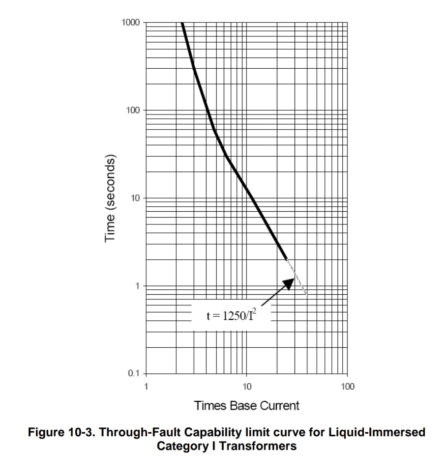 그림 10-3은 카테고리 I 변압기의 통과 고장 능력 한계 커브를 보여줍니다. 커브는 열적 기계적 고려 사항들을 모두 반영합니다. 기본 전류의 25-40배의 단락 전류에 대하여 1250의 I2t가 커브를 정의합니다. 여기서 I는 변압기 기본 전류의 배수로 대칭 고장 전류이고 t는 sec입니다.