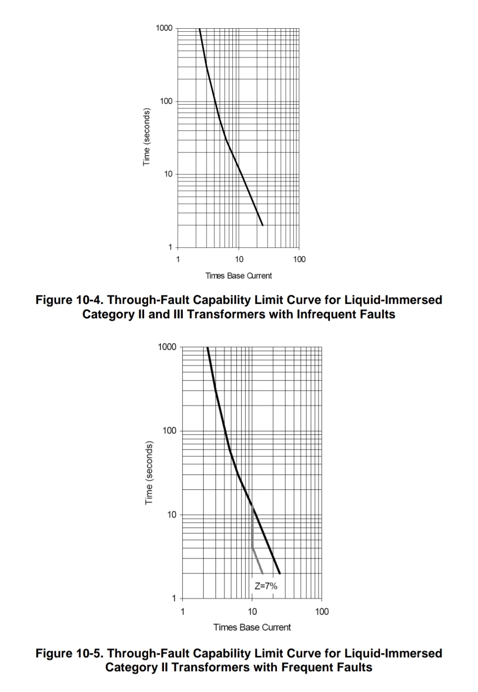 그림 10-4는 고장이 자주 발생하지 않는 조건(infrequent fault) 하에 설치되는 카테고리 II 와 III 변압기에 대한 통과 고장 능력 한계 커브 (through-fault capabilty limit curve)를 나타냅니다. 이 커브는 2초까지로 제한됩니다.