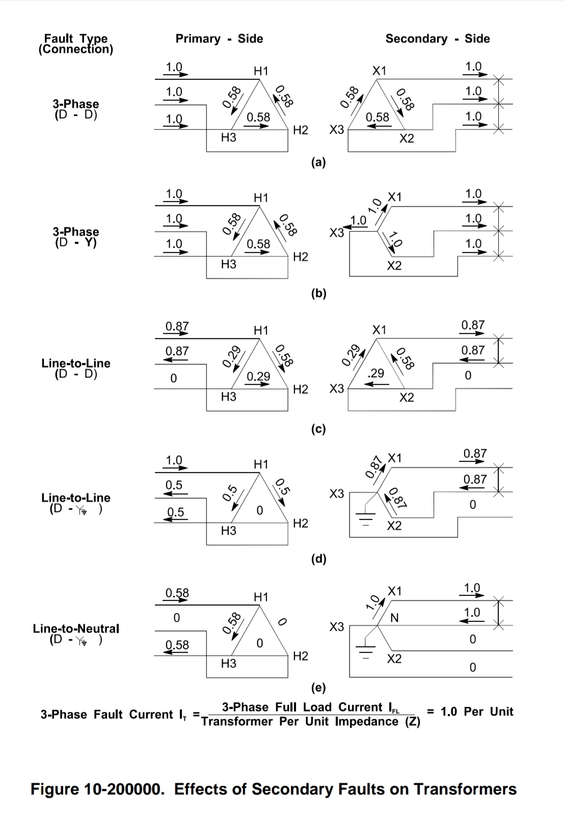 통과 고장 보호 커브는 삼상 2차 고장에 기초합니다. D-Y로 결선되고 직접 접지된 변압기들은 2차 측의 단상 지락 고장에서 커브 값이 삼상 커브 값의 58% (1/√3)로 줄어듭니다. (10-2e) D-D 결선 변압기에서는 2차 측에서의 선간 단락 고장 시에 커브 값이 삼상 값의 87% (√3/2)로 줄어듭니다. (10-2c) 다른 결선에서는 조정이 필요 없습니다. 1차 측의 한상이 1.0pu 전류를 보이기 때문입니다.