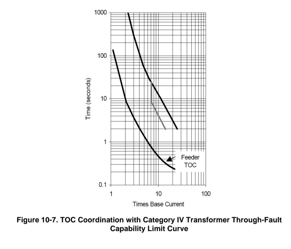다수의 피더가 저압 버스에 연결되는 배전 변압기의 적용 시에 피더 계전기는 보호의 첫 번째 라인이 됩니다. IEEE C37.91은 그림 10-7에서 보이듯이 변압기의 통과 고장 능력 한계 커브와 보호 협조를 위해서 반한시 과전류 특성의 피더 계전기 선정을 추천합니다.