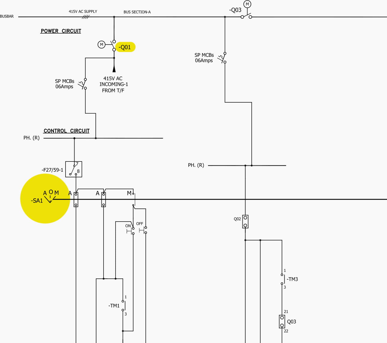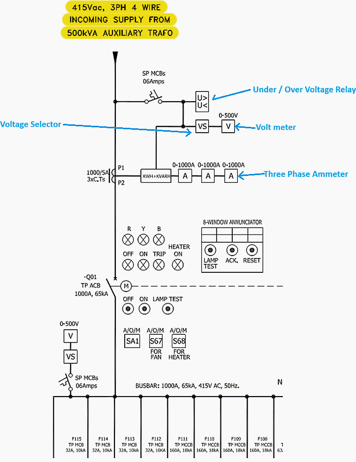 각 상을 나타내는 빨간색, 노란색, 파란색의 3상 표시등이 제공됩니다. Q01은 1000A 연속 전류 및 65kA 단시간 등급의 공기 차단기(ACB)입니다. "M"은 ACB가 모터로 작동 중임을 나타냅니다. 차단기는 여러 피더가 연결된 LV 버스에 연결되어 있습니다.